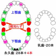 赤色に塗り潰した4本の親知らず以外に、星印(側切歯4本)、リボン印(第二小臼歯4本)、淡緑色丸印(第二大臼歯4本)、そして下顎では黒三角印(中切歯2本)が欠如することがあります。